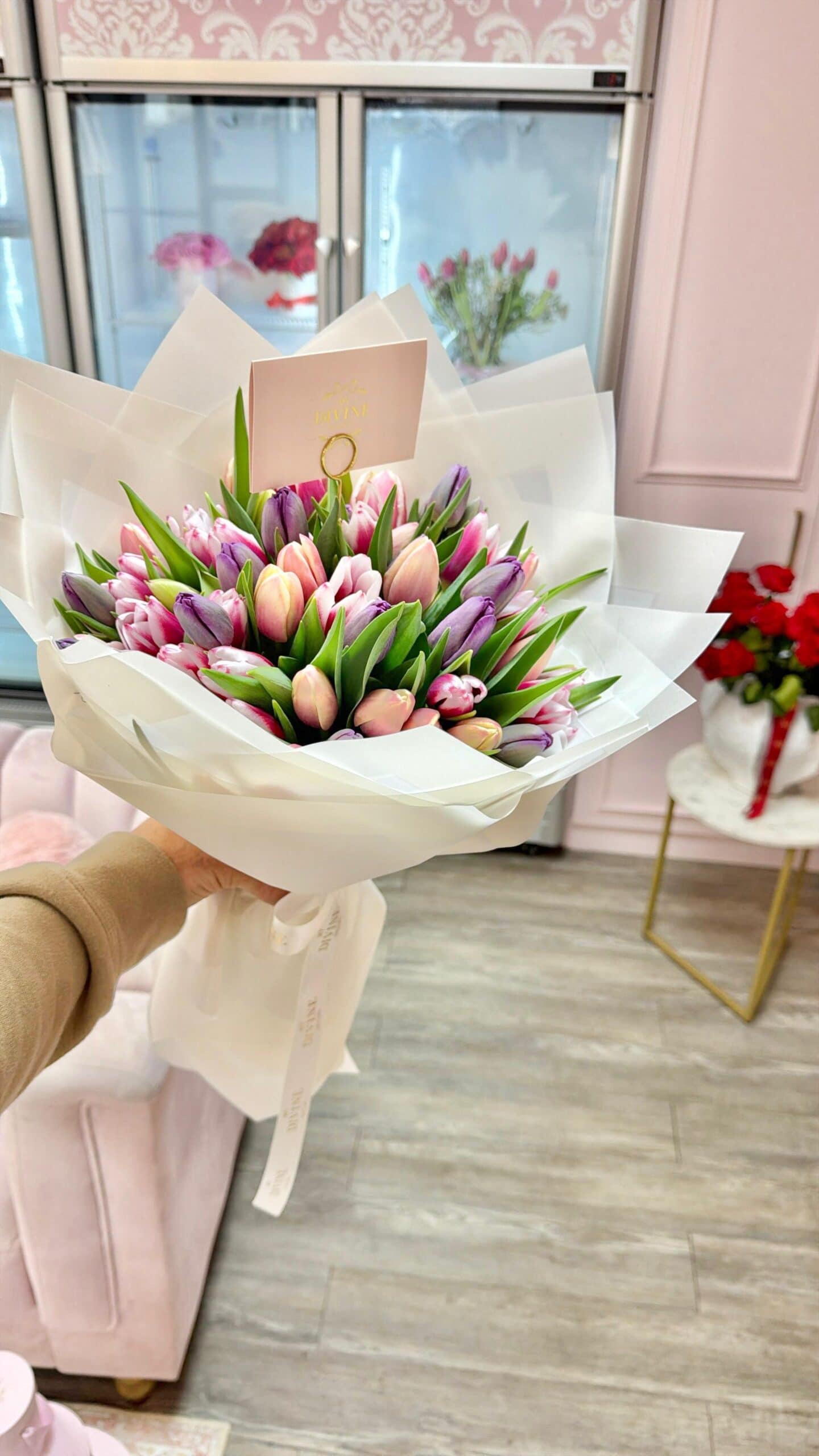 These is a hand wrapped bouquet of fresh tulips. Keep in mind these flowers are with no water.