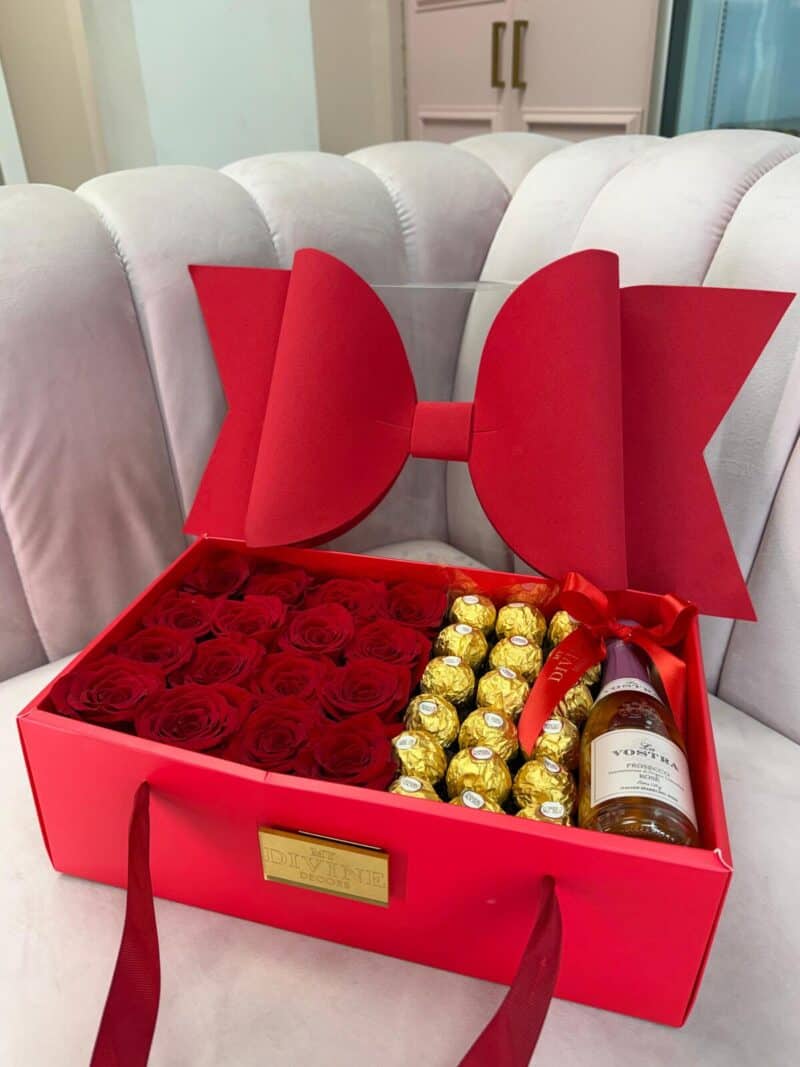 Designed to impress, this luxurious gift box features fresh premium red roses, Ferrero Rocher chocolates, and a bottle (assorted), all beautifully arranged inside our signature keepsake box adorned with an oversized bow.